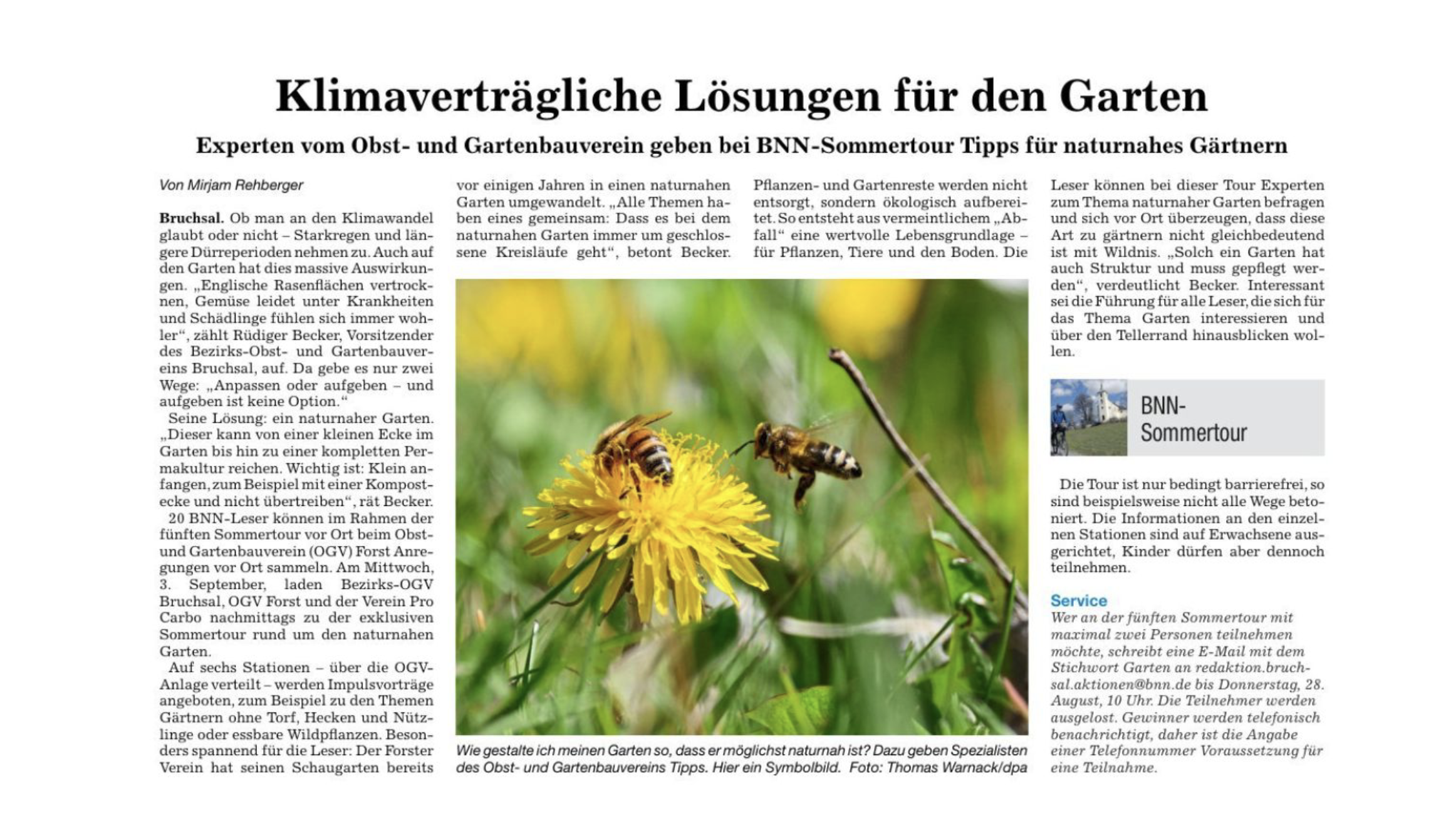 Achtung: Teilnahme an dieser exklusiven Veranstaltung nur über die BNN möglich! Kontakt: Siehe Artikel! Klimaverträgliche Lösungen für den Garten Experten vom Obst- und Gartenbauverein Forst, vom Verein Pro Carbo und dem Bezirks-OGV geben bei BNN-Sommertour Tipps für naturnahes Gärtnern Wie gestalte ich meinen Garten so, dass er möglichst naturnah ist? Dazu geben Spezialisten des Obst- […]