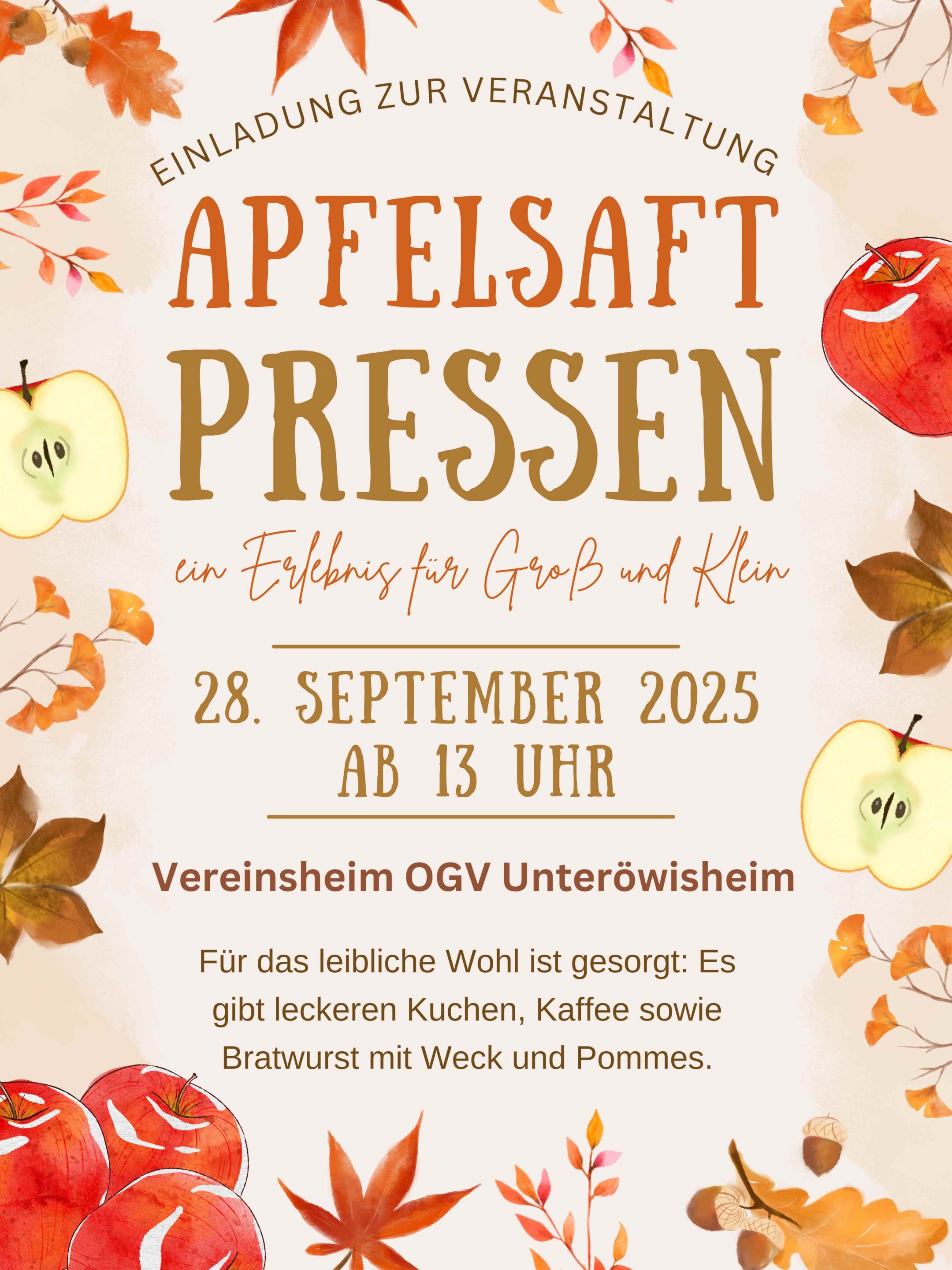Apfelsaftpressen am Europaplatz in Bruchsal Termin: Sonntag 12. Oktober 2025 ab 12:00 Uhr beim Europaplatz Es ist keine Anmeldung erforderlich.